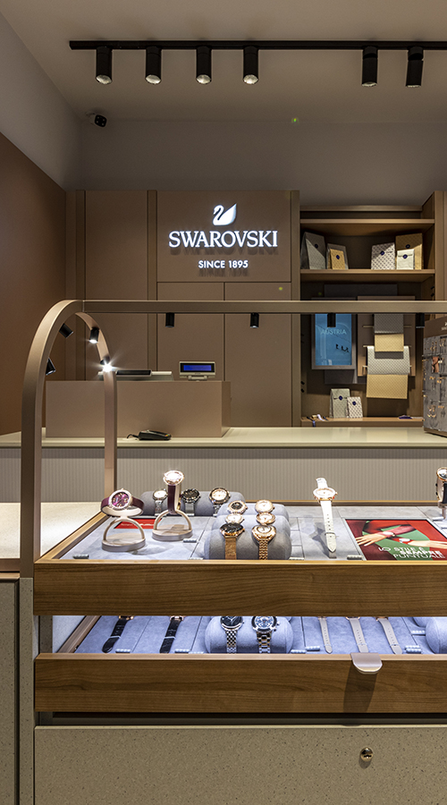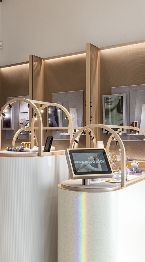 A new ‘sparkle’ bar in the middle of the store serves as the focal point for both product display and customer experience, where an interactive mirror offers real-time previews of the products selected and tried on. A custom chandelier, featuring Swarovski crystals, crowns the bar and adds an element of sparkle to the interior.